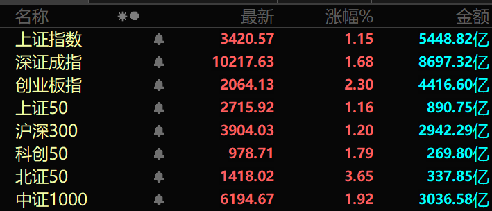 今日,A股强势上攻,北证50大涨3.65%,收复1400点,创业板指亦高开高走放量大涨2.3%,创近1个半月来最大单日涨幅,上证指数也涨超1%,创3个多月来新高,并逼近年内最高点。超4800只个股上涨,成交放大至1.45万亿元。