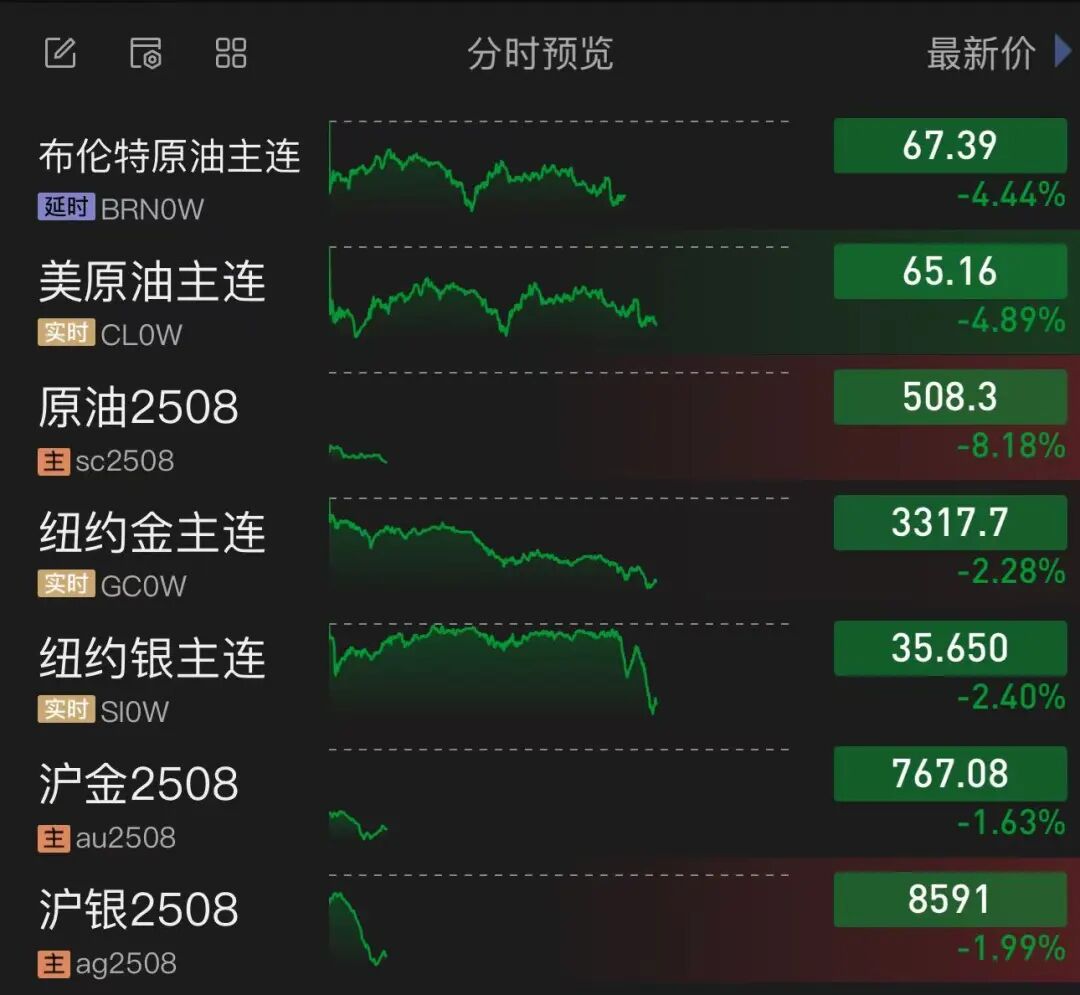 原油更是崩跌。截至发稿,布伦特原油、美原油主力合约均跌超4%,国内原油主力合约跌超8%。