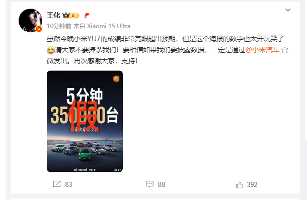 最新消息显示,小米集团公关部总经理王化最新辟谣称,虽然今晚(6月26日)小米YU7的成绩非常亮眼超出预期,但5分钟破350000台的海报数字也太开玩笑了,他表示,请大家不要捧杀小米,若要披露数据,一定是通过@小米汽车官微发出。
