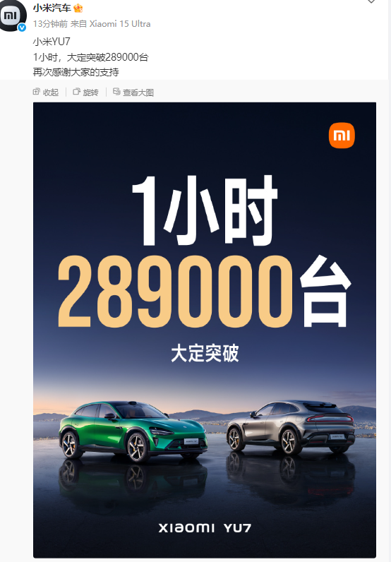 此前,小米汽车官微称,3分钟,小米YU7大定突破200000台。1小时,大定突破289000台。