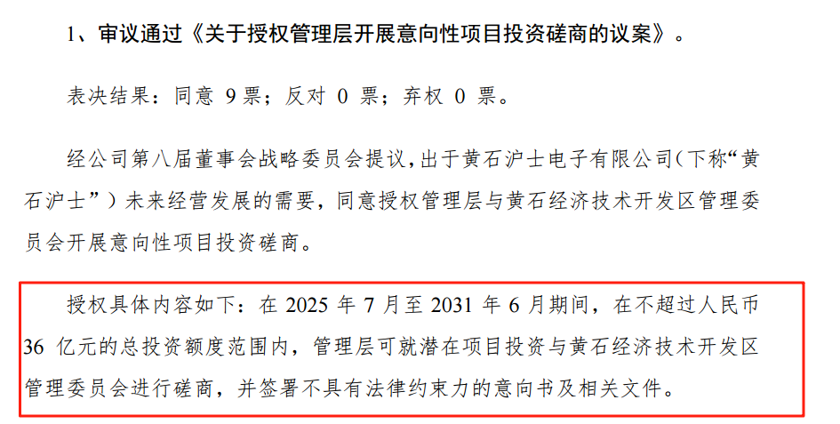 7月3日下午,800亿市值半导体巨头沪电股份(002463)称,经公司董事会战略委员会提议,出于黄石沪士电子有限公司(下称“黄石沪士”)未来经营发展的需要,董事会同意授权管理层与黄石经济技术开发区(下称“黄石经开区”)管理委员会开展意向性项目投资磋商,总投资额度不超过36亿元。