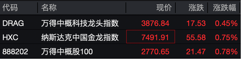中概股表现相对强势。截至发稿,纳斯达克中国金龙指数涨幅为0.75%。