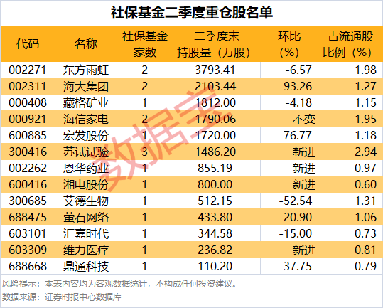 从持股比例看,社保基金持有比例最多的是苏试试验,持股量占流通股比例为2.94%,其次是东方雨虹,社保基金持股比例为1.98%,持股比例居前的还有海信家电、艾德生物、海大集团等。持股数量方面,社保基金持股量最多的是东方雨虹,共持有3793.41万股,海大集团、藏格矿业等紧随其后,持股量分别为2103.44万股、1812万股。
