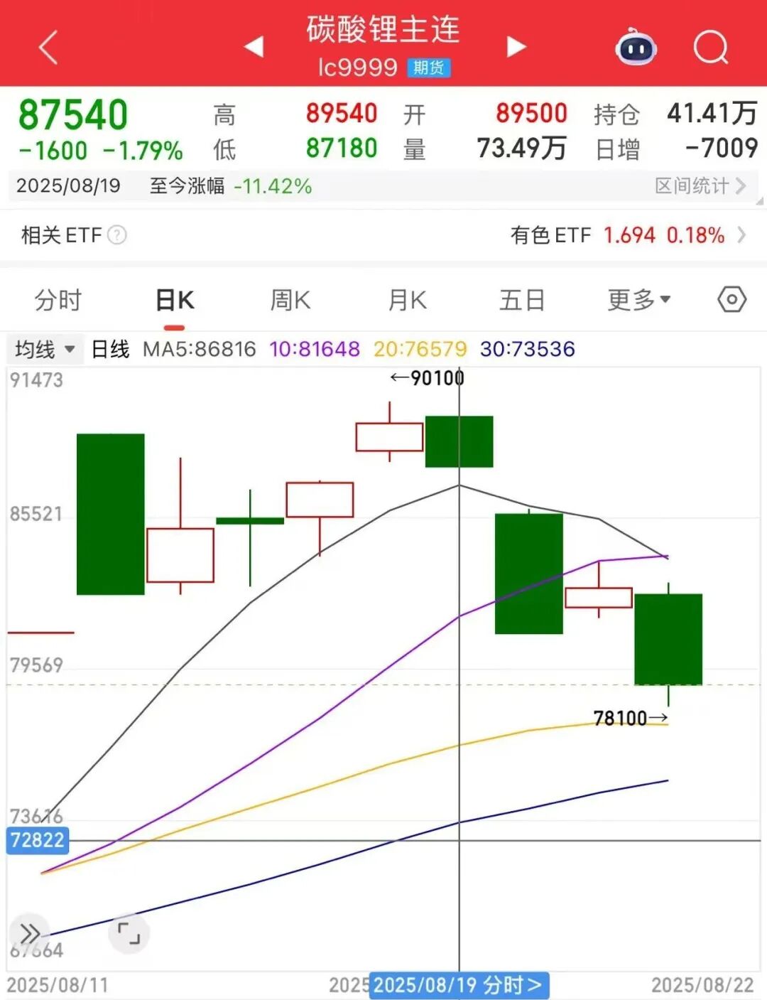 上周,碳酸锂期货价格大幅回调。8月23日,碳酸锂期货主力合约收报78960元/吨,最近4个交易日累计跌超11%。