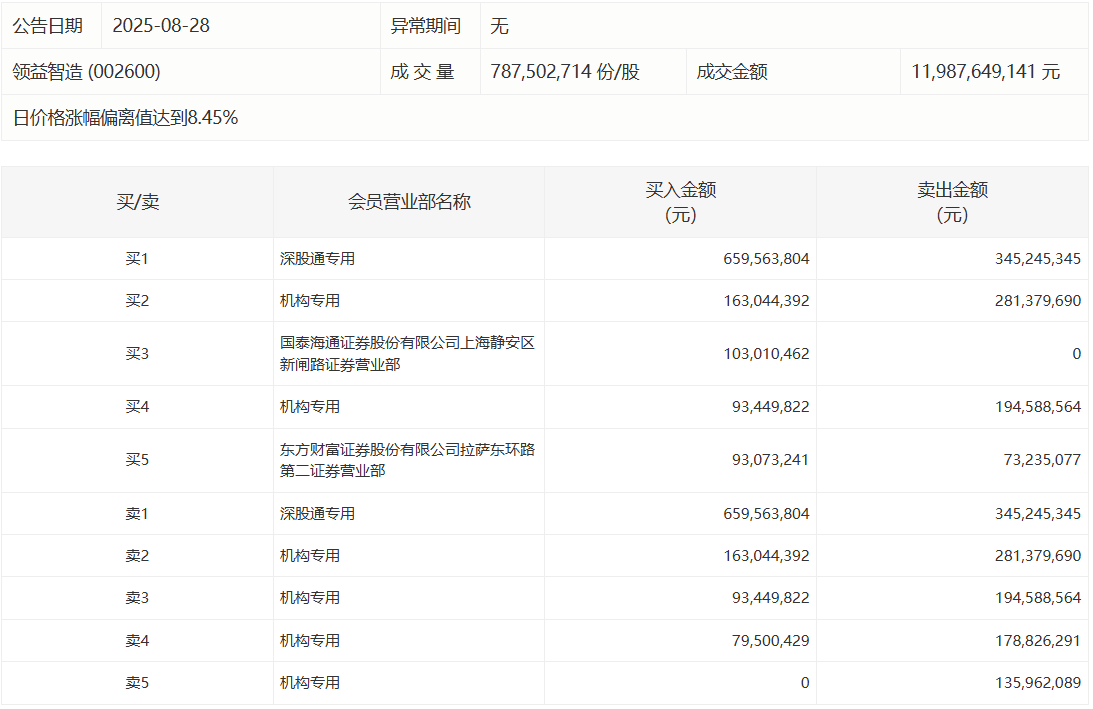 人民财讯8月28日电,领益智造今日涨停,成交额119.88亿元。盘后龙虎榜数据显示,深股通专用席位买入6.6亿元并卖出3.45亿元,4家机构专用席位净卖出4.55亿元。