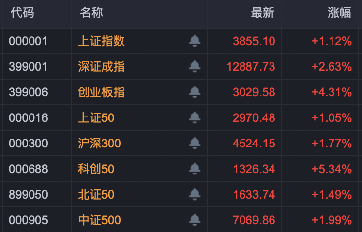 今日早盘,A股强势上攻,科创50指数放量大涨逾5%;创业板指亦涨超4%,创3年半来新高;上证指数、深证成指、北证50等也纷纷走强,成交呈温和放大趋势。