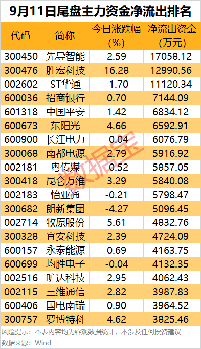 固态电池股先导智能尾盘主力资金净流出1.71亿元,居首;还有胜宏科技、ST华通、招商银行、中国平安等尾盘净流出金额居前。