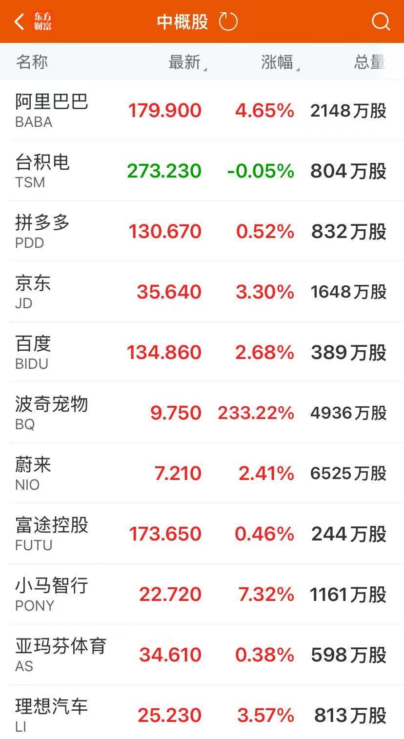 热门中概股多数收涨,小马智行涨7.32%,哔哩哔哩涨4.75%,阿里巴巴涨4.65%,新东方涨4.38%,理想汽车涨3.57%,京东涨3.3%,百度涨2.68%,蔚来涨2.41%,小鹏汽车涨1.76%,好未来涨0.63%,拼多多涨0.52%,腾讯音乐涨0.42%。