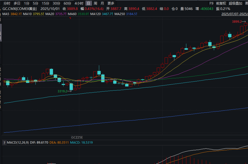 国际金价继续上行。当地时间周二,COMEX黄金期货主力合约盘中逼近3900美元/盎司,再创历史新高。