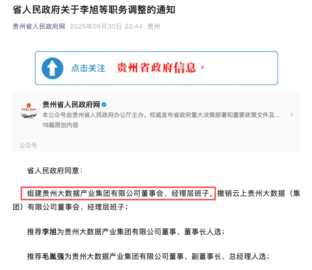 9月30日晚间,贵州省人民政府网微信公众号发文称,省人民政府同意组建贵州大数据产业集团有限公司(下称“贵州大数据”)董事会、经理层班子,撤销云上贵州大数据(集团)有限公司(下称“云上贵州”)董事会、经理层班子。