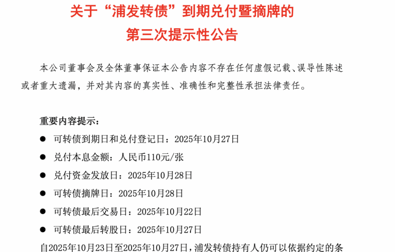 在停止交易后、转股期结束前(即自10月23日至27日),浦发转债持有人仍可以依据约定的条件将浦发转债转换为公司普通股。10月28日,浦发转债将在上交所摘牌。