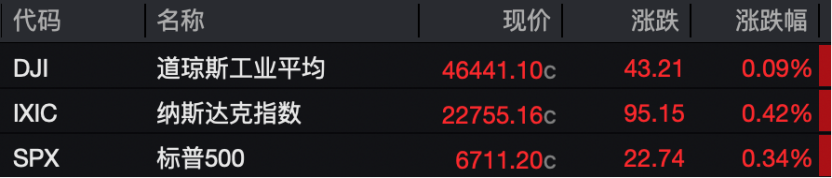 当地时间10月1日,美国股市三大股指小幅收涨,其中道琼斯工业指数涨0.09%,报46441.1点,标准普尔500指数涨0.34%,报6711.2点,纳斯达克指数涨0.42%,报22755.16点。其中,标准普尔500指数盘中创历史新高。