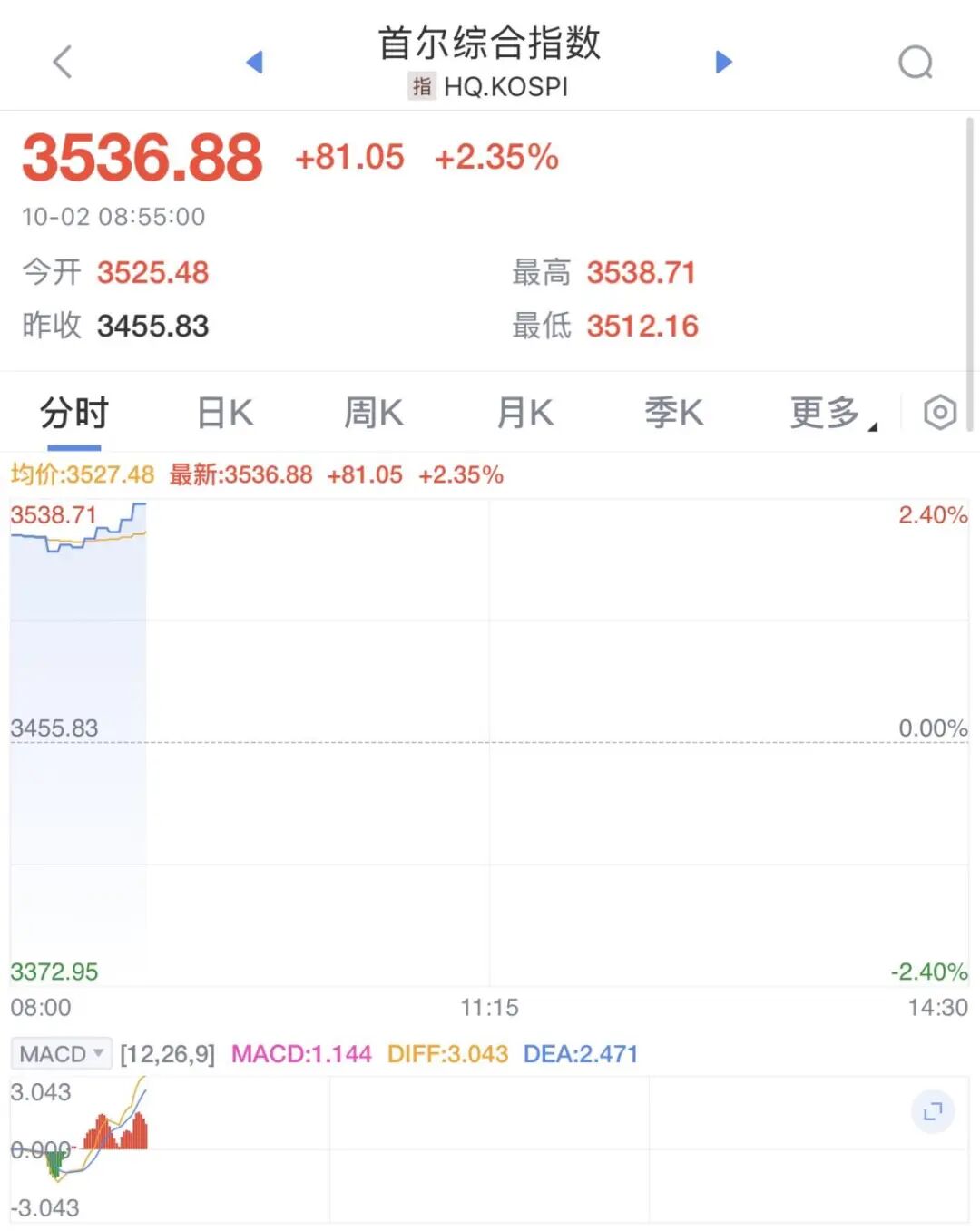 10月2日,韩国KOSPI指数一度大涨2.4%,再创历史新高。
