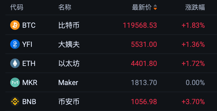 数字货币市场大涨。比特币盘中突破11.9万美元,以太坊突破4400美元。数字货币概念股暴涨。嘉楠科技涨超28%,GD CULTURE涨超11%,比特数字涨超8%。