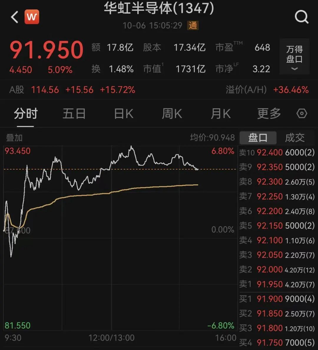 早盘一度录得跌幅的中芯国际午后转涨,最高涨1.71%触及92.65港元,股价再创历史新高;市值超1700亿港元的华虹半导体涨幅一度扩大至6%,上摸93.45港元,也创历史新高,该股年内累计涨超330%。