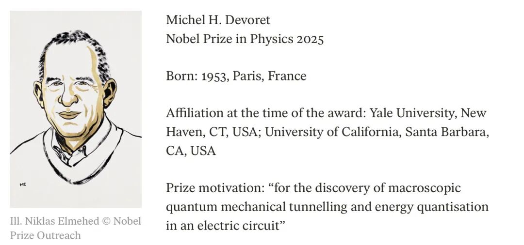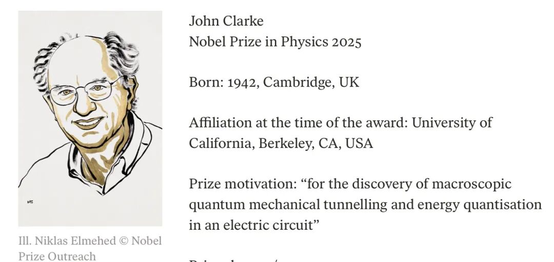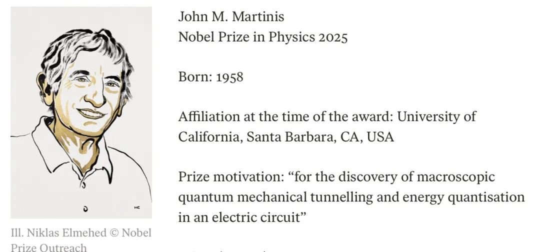 当地时间10月7日,瑞典皇家科学院宣布,将2025年诺贝尔物理学奖授予约翰·克拉克、米歇尔·H·德沃雷特和约翰·M·马蒂尼斯,以表彰其“在电路中发现宏观量子力学隧穿和能量量子化”。