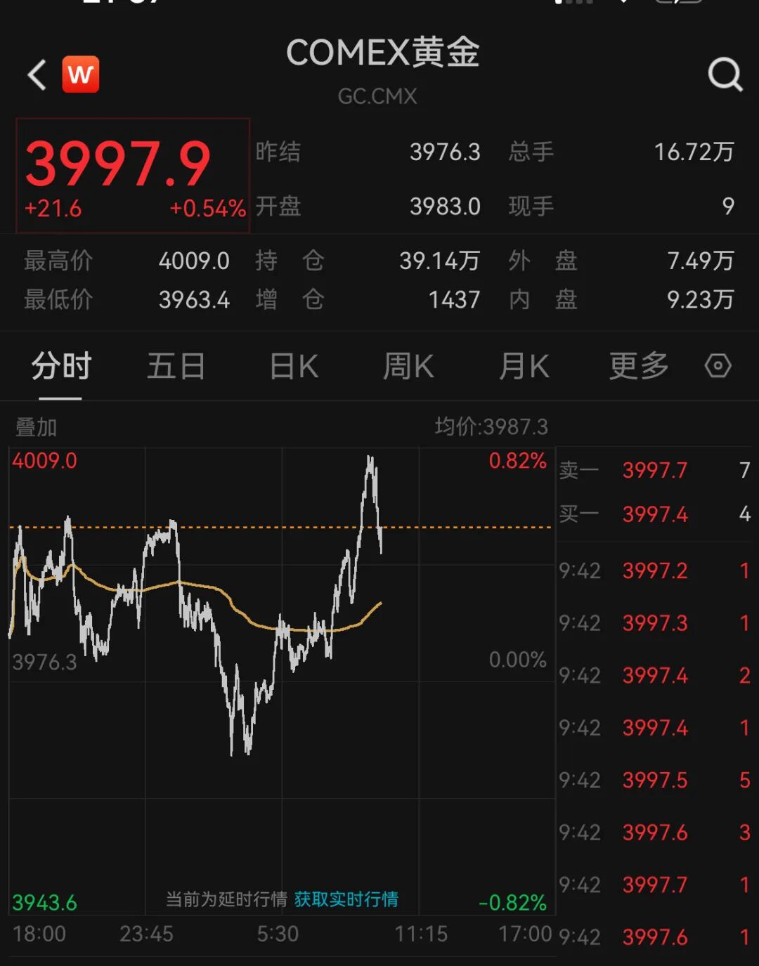 黄金延续涨势。现货黄金日内涨0.5%,触及3980美元/盎司,创历史新高。COMEX黄金期货盘中首次突破4000美元/盎司。