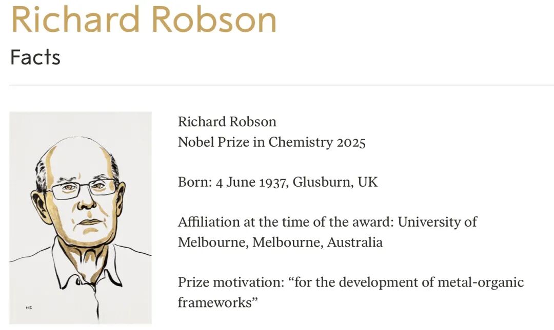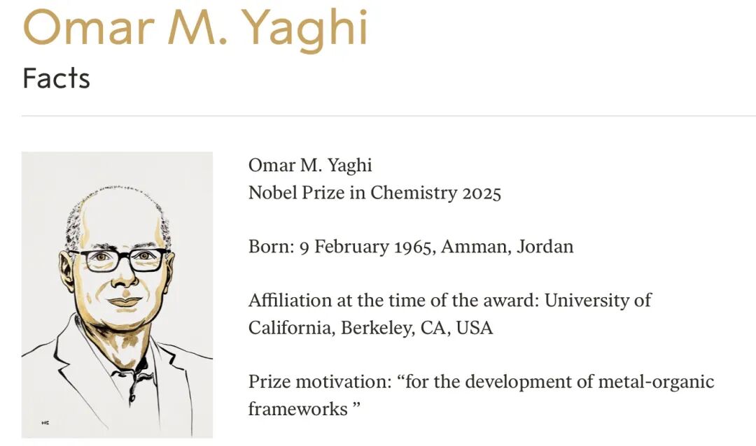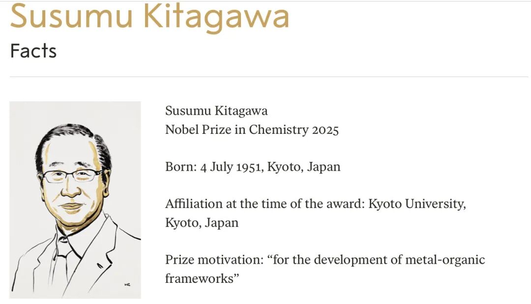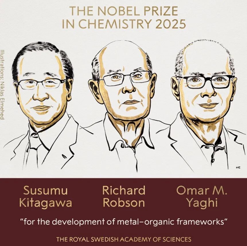 瑞典皇家科学院当地时间10月8日宣布,将2025年诺贝尔化学奖授予北川进 (Susumu Kitagawa)、理查德·罗布森(Richard Robson)和奥马尔·M·亚吉 (Omar M. Yaghi),以表彰他们“在金属有机框架领域的发展”。