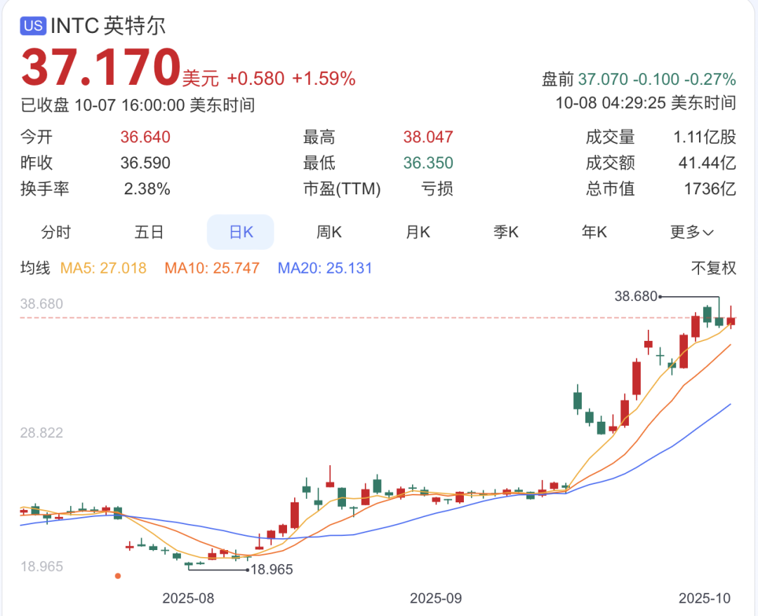 数据显示,英特尔股价在过去一个月上涨了超50%,今年迄今累计上涨了超83%。
