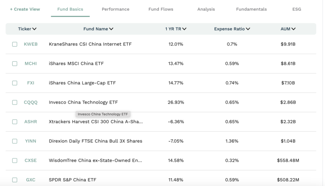 截至目前,在美国上市、规模超过5亿美元的中国股票ETF包括:KWEB,跟踪中证海外中国互联网指数;MCHI,跟踪MSCI中国指数;FXI,跟踪富时中国50指数;CQQQ,跟踪FTSE China Incl A 25% Technology Capped指数;ASHR,跟踪沪深300指数;YINN为一只三倍杠杆ETF,底层指数为富时中国50指数;CXSE,跟踪Wisdom Tree中国非国企指数;GXC,跟踪标普中国指数。