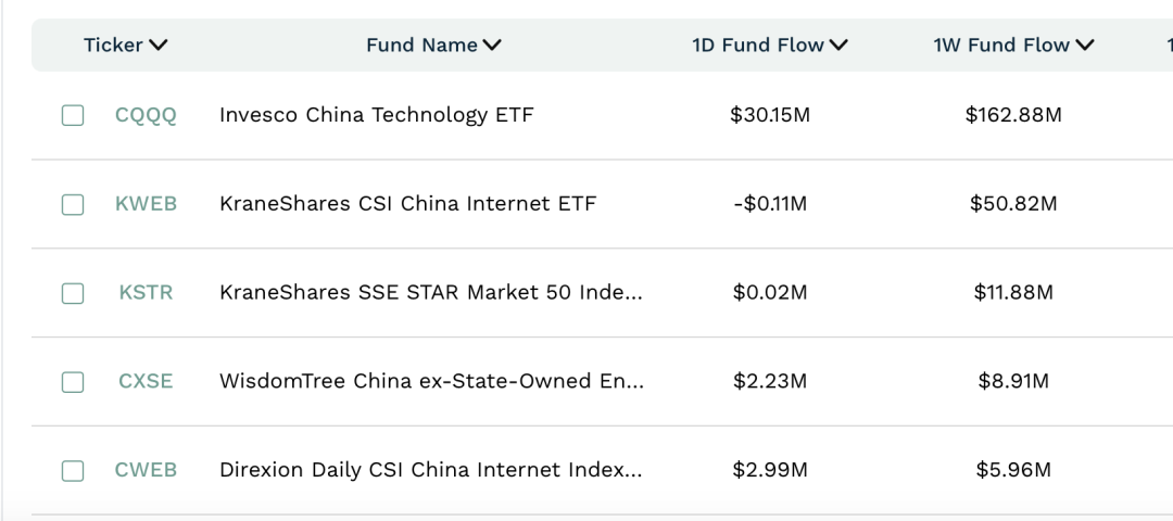 资金流向方面,过去一周,CQQQ吸金1.63亿美元,KWEB吸金5082万美元,KSTR吸金1188万美元,CXSE吸金891万美元,CWEB吸金596万美元。上述ETF的科技含量较高。