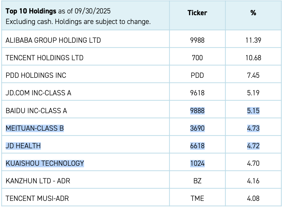 KWEB由金瑞基金发行,在纽交所上市,跟踪中证海外中国互联网指数。截至今年三季度末,该指数的前十大重仓股分别为阿里巴巴、腾讯控股、拼多多、京东、百度、美团、京东健康、快手、看准科技、腾讯音乐。2020年中金公司收购了金瑞基金的多数股份,成为控股股东。