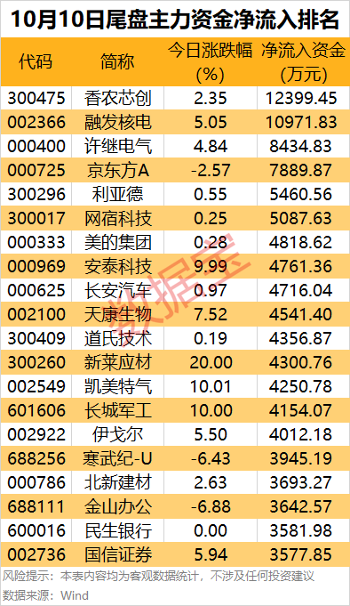 存储芯片概念股香农芯创尾盘主力资金净流入1.24亿元,居首;可控核聚变概念股融发核电尾盘主力资金净流入1.1亿元,居次席。