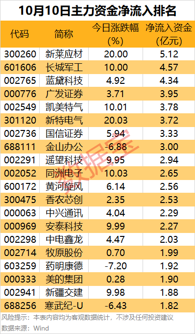 此外,还有蓝黛科技、广发证券、凯美特气、新特电气等热门股主力资金净流入居前,均超3亿元。