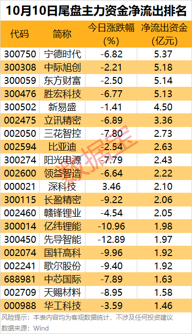 宁德时代、中际旭创、东方财富和胜宏科技尾盘主力资金净流出均超5亿元;新易盛、立讯精密、三花智控、比亚迪等热门股尾盘净流出金额居前。