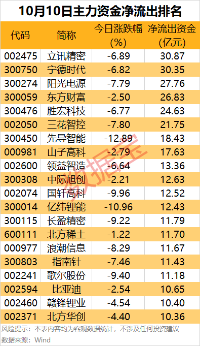 多只行业龙头股遭到主力资金大手笔抛售,立讯精密和宁德时代主力资金净流出均超30亿元;阳光电源、东方财富、胜宏科技、三花智控主力资金净流出金额均超21亿元。