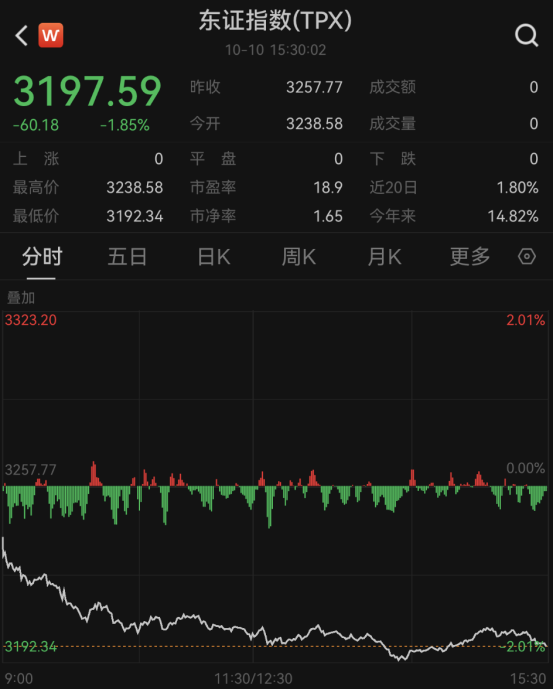 在此之前,日本股市亦全线走低,日本东证指数盘中一度暴跌超2%,截至收盘,跌幅达1.85%,日经225指数跌1.01%。