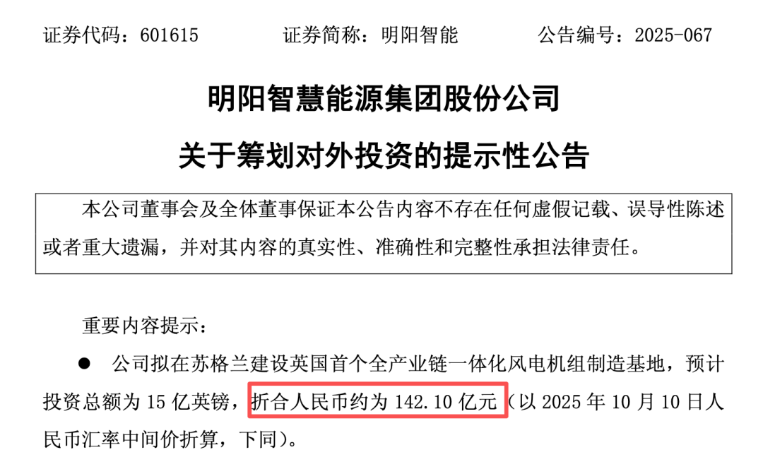明阳智能(601615)10月12日晚公告,公司拟在苏格兰建设英国首个全产业链一体化风电机组制造基地,预计投资总额为15亿英镑,折合人民币约为142.1亿元,将用于建设海上与漂浮式风电机组制造工厂。
