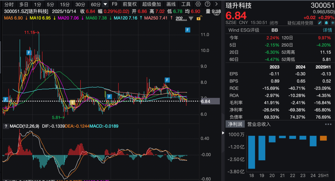 截至10月14日收盘,琏升科技股价为6.84元/股,总市值约为25亿元。