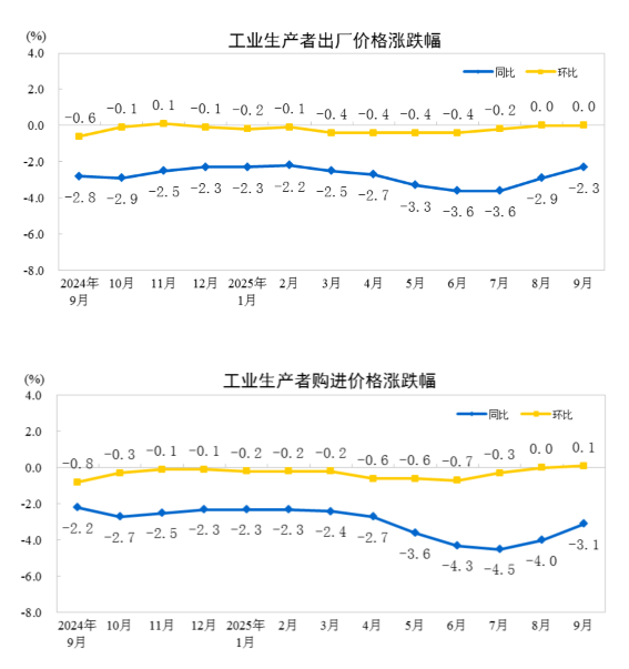 人民财讯10月15日电,据国家统计局,2025年9月份,全国工业生产者出厂价格同比下降2.3%,降幅比上月收窄0.6个百分点,环比继续持平。工业生产者购进价格同比下降3.1%,降幅比上月收窄0.9个百分点,环比上涨0.1%。1—9月平均,工业生产者出厂价格比上年同期下降2.8%,工业生产者购进价格下降3.2%。