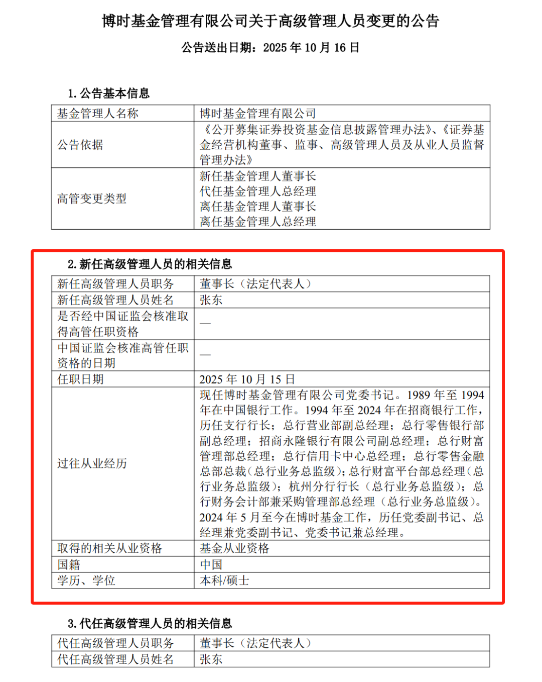 公告还显示,张东正式接任博时基金党委书记、董事长,并自2025年10月15日起代任总经理一职。