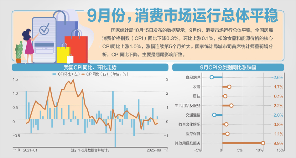 冯琳预计,在上年同期基数下沉、促消费政策效应显现等带动下,10月CPI同比有望升至0.1%左右。后期伴随上年同期物价基数显著下沉,加之包括以旧换新等在内的稳增长政策会进一步发力,CPI同比预计会脱离零值附近,有望在年底前升至0.5%至1.0%区间。