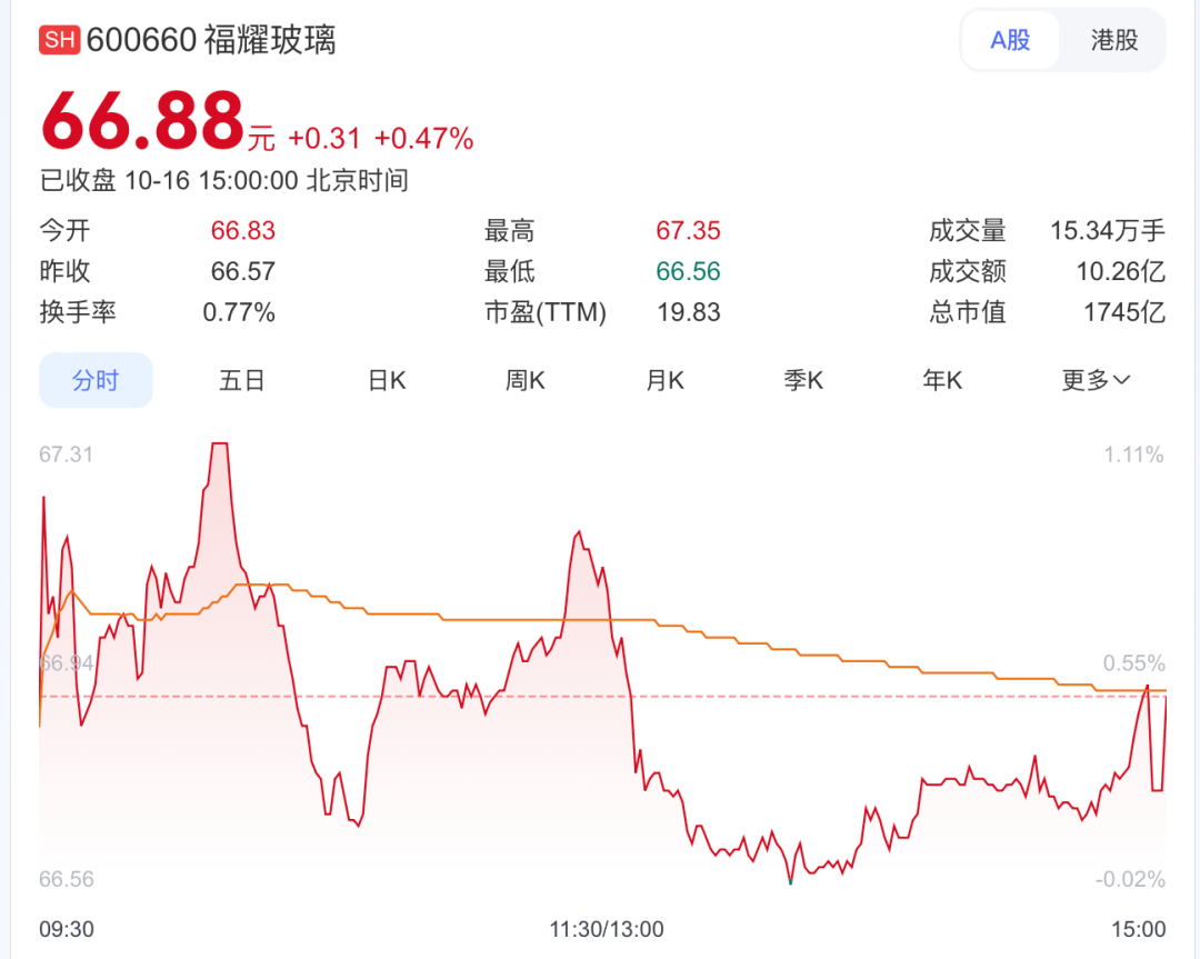 截至16日收盘,福耀玻璃涨0.47%,报66.88元/股,最新市值超1700亿元人民币。
