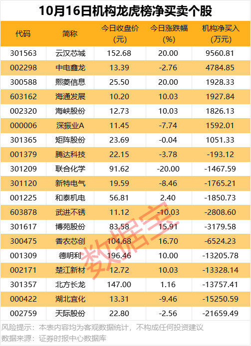 今日龙虎榜中,机构净买入的个股7只,净卖出的个股12只。云汉芯城、中电鑫龙获机构净买入金额居前,分别为9560.81万元、 4784.85万元 ;熙菱信息、海通发展等个股也均获机构净买入超1000万元。