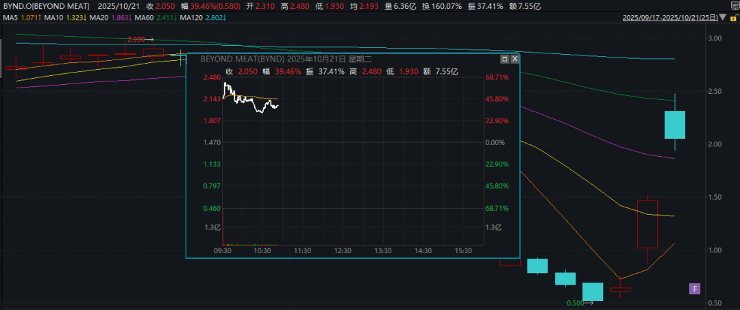 上周,股价跌破1美元的“人造肉第一股”Beyond meat(BYND)一度拉响退市警报。但自上周五(10月17日)开始,该公司连续股价连续大幅上涨。上周五,Beyond meat股价盘中一度涨超40%,收涨约24%。本周一,Beyond meat估计则是大涨约127%,盘中一度涨超136%。周二开盘后,Beyond meat一度上涨超过68%,近三个交易日股价累计最高涨幅超过300%。