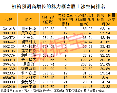 以10月22日收盘价与机构一致预测目标价相比,14股上涨空间超过10%。申菱环境上涨空间62.16%,排在第一位。上涨空间较大的还有奥飞数据、太辰光、润泽科技、沃尔核材、莲花控股等。