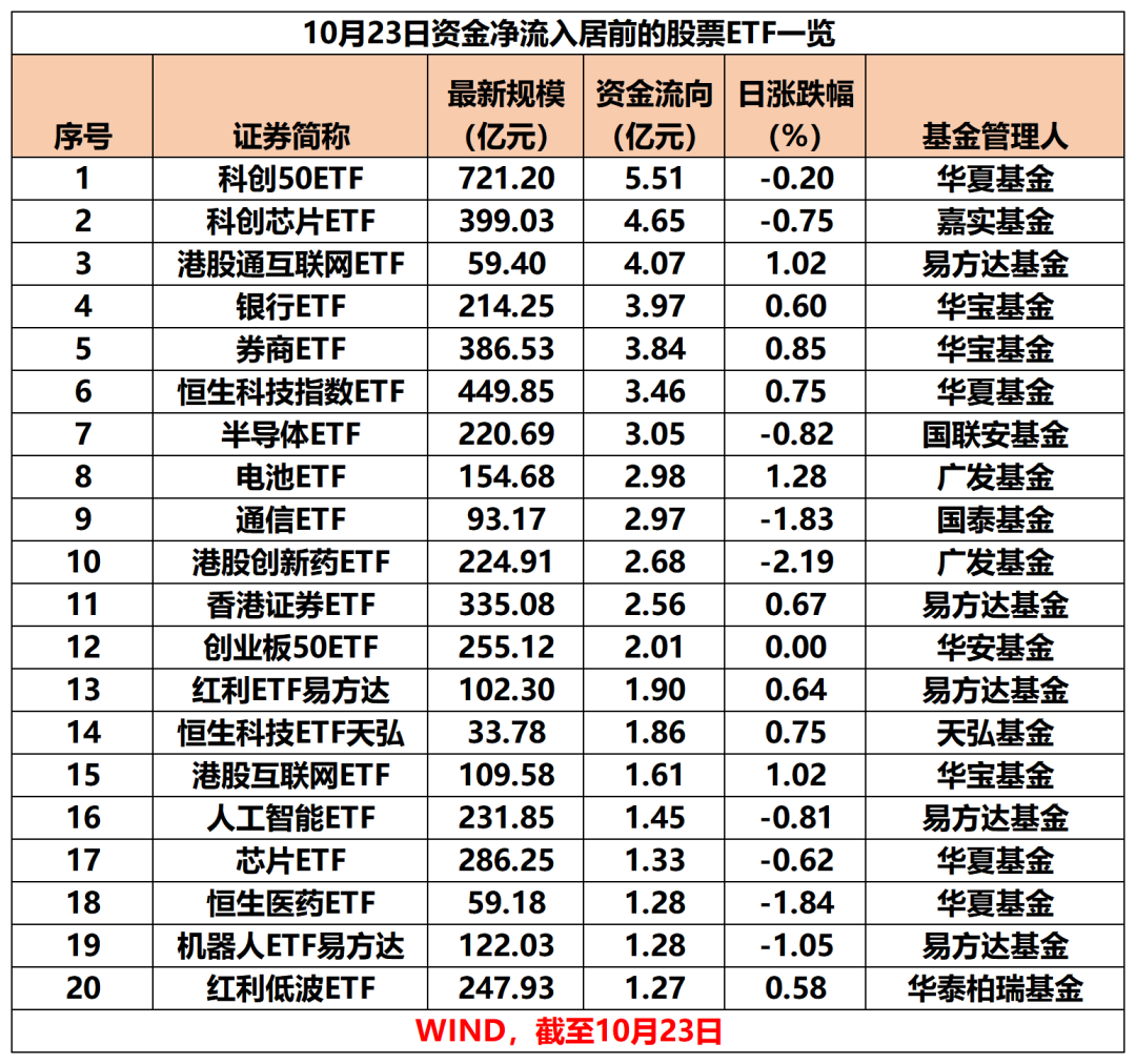 10月23日,A股大盘探底回升,三大指数全线收涨。当日股票ETF(含跨境ETF)整体资金净流入达33.6亿元。