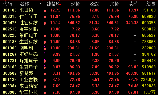 CPO概念等AI产业链股盘中走势强劲,截至收盘,东田微涨近13%,盘中一度涨停;仕佳光子涨约12%,景旺电子、生益科技、德明利等均涨停;新易盛涨逾8%突破400元大关,中际旭创涨约3%突破500元大关,盘中均创出新高。