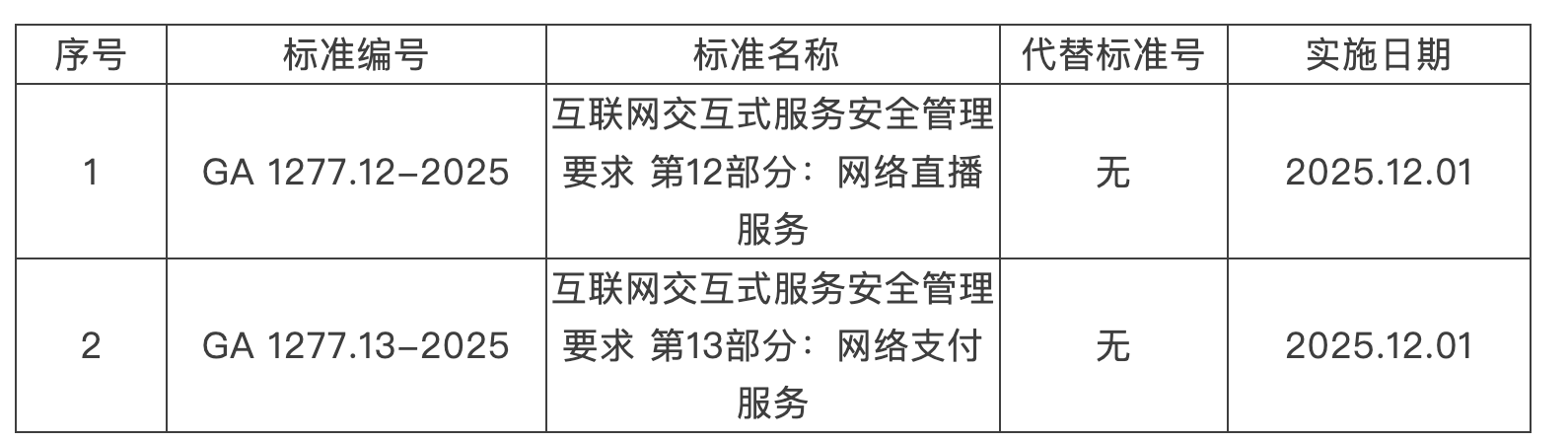 人民财讯10月29日电,近日,公安部发布的2025年第1号《中华人民共和国公安部公共安全行业标准公告》,由公安部信息系统安全标准化技术委员会归口的8项公共安全行业标准正式发布。其中强制标准包括《互联网交互式服务安全管理要求 第12部分:网络直播服务》《互联网交互式服务安全管理要求 第13部分:网络支付服务》,以上强制性标准将于2025年12月1日起正式实施。其他6项推荐性标准将于2026年2月1日起正式实施。