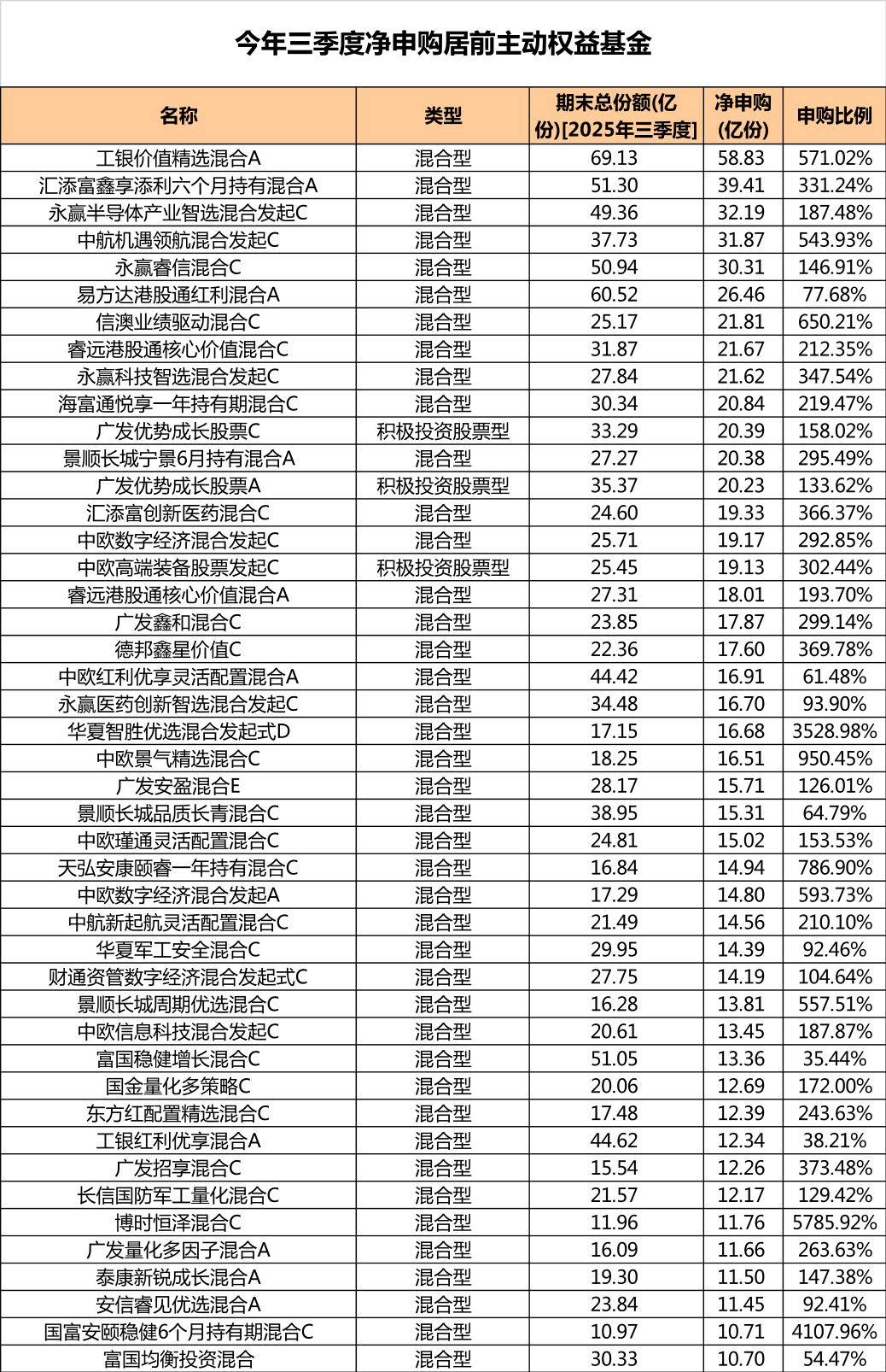 45只主动权益基金获10亿份以上净申购