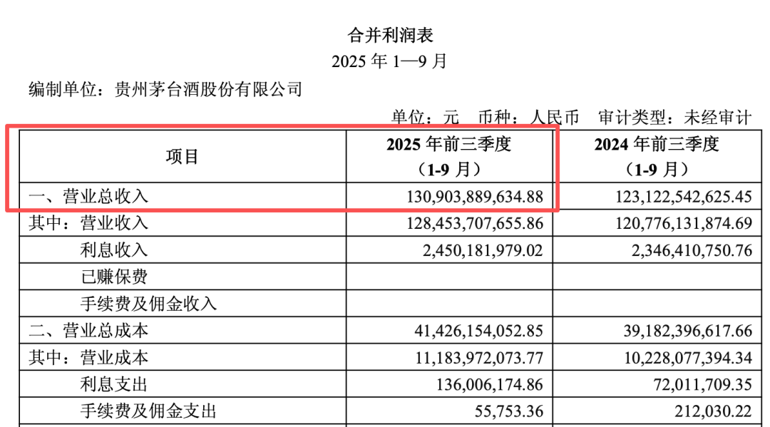 10月29日,贵州茅台(600519)发布第三季度报告,1-9月公司实现营业总收入1309.04亿元,同比增长6.32%;利润总额894.03亿元,同比增长6.37%;归母净利润646.26亿元,同比增长6.25%。