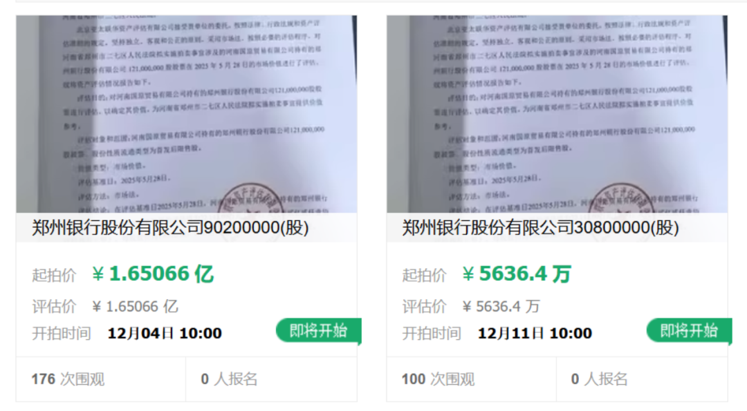 其中一笔将于12月4日起拍,为河南国原贸易有限公司持有的郑州银行9020万股,起拍价为1.65066亿元,保证金高达3000万元。