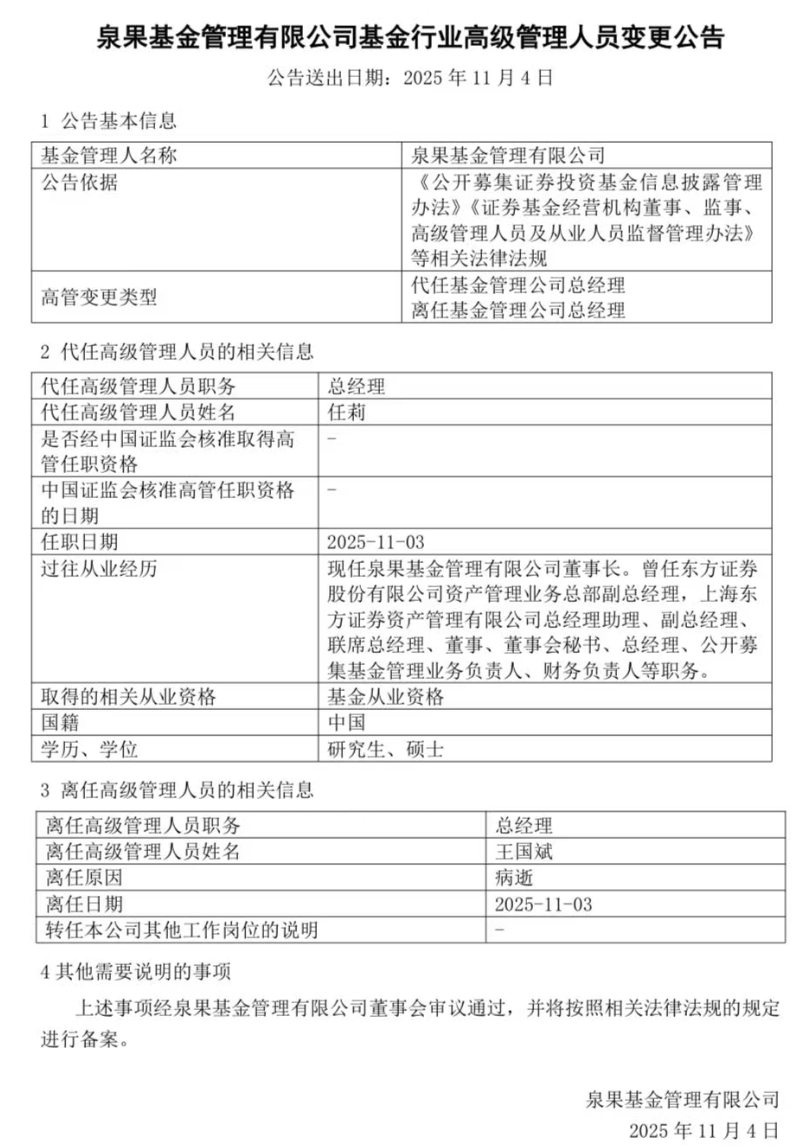 11月3日,泉果基金发布高级管理人员变更公告,王国斌病逝,由董事长任莉代任总经理职务,任职日期2025年11月3日。
