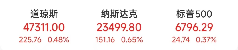 当地时间周三(11月5日),美股三大指数集体收高。道指涨225.76点,涨幅为0.48%,报47311.00点;纳指涨151.16点,涨幅为0.65%,报23499.80点;标普500指数涨24.74点,涨幅为0.37%,报6796.29点。