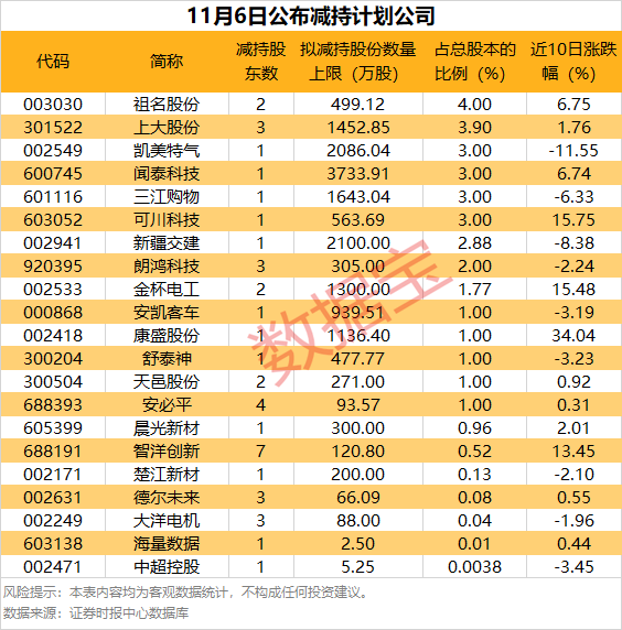 11月6日,21家公司发布了减持计划,拟减持比例居前的有祖名股份、上大股份、凯美特气、闻泰科技等。从股价表现看,凯美特气、闻泰科技等多只热门股今日早盘一度跌超5%。