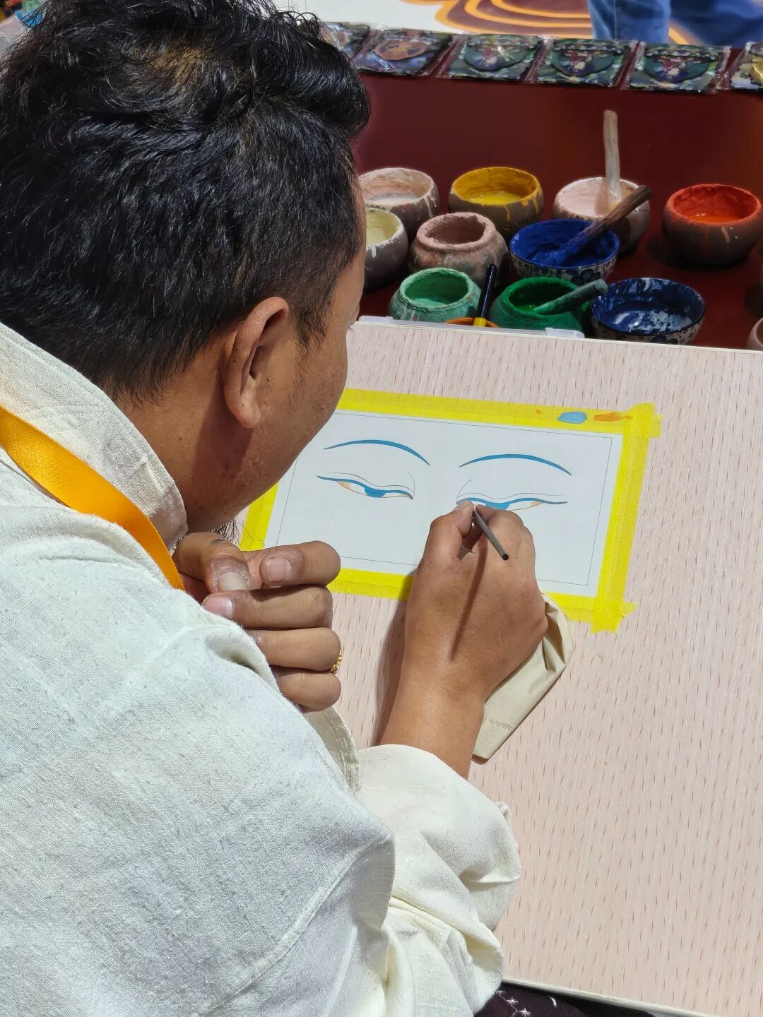 西藏青年画家嘎桑久美正在陶瓷上作画,陶瓷唐卡是近年来新兴起的表现形式,现已成为西藏传统艺术与现代工艺融合的代表性产物。